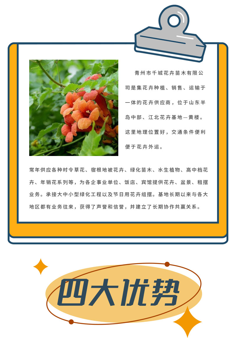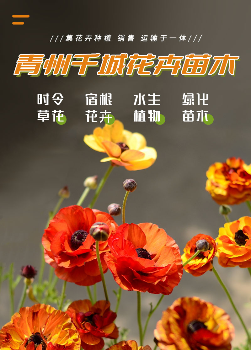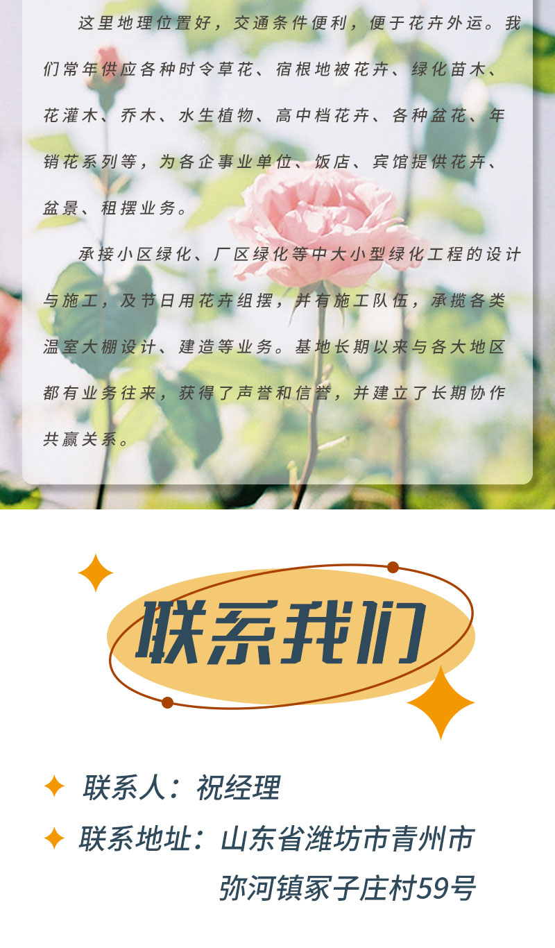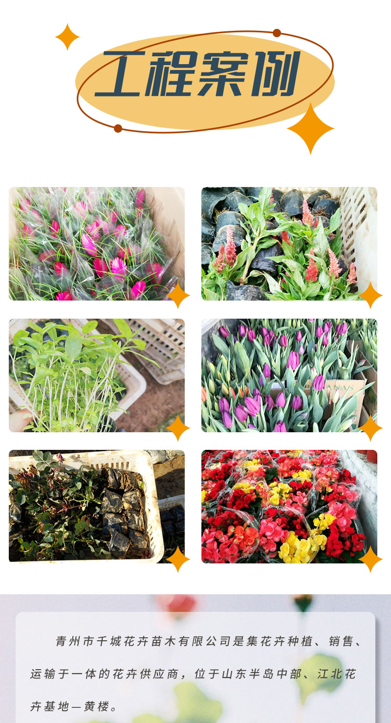 青州市千城花卉苗木有限公司,是一家从事花卉、便宜草花、绿化苗木为一体的公司。我们位于——山东省青州市弥河镇。这里地理环境好,交通便利,主要经营:节日用草花、花坛花、时令花,盆花、年宵花。绿化苗木、宿根地被,并承接草花租摆,购销配送业务和各花卉工程。培育销售各时令草花、宿根花卉,水生花卉,各盆花,乔木、花灌木,绿化小苗等上百个品种,种类繁多,规格多样,是您购花、赏花的理想选择。欢迎各界朋友光临指导。
