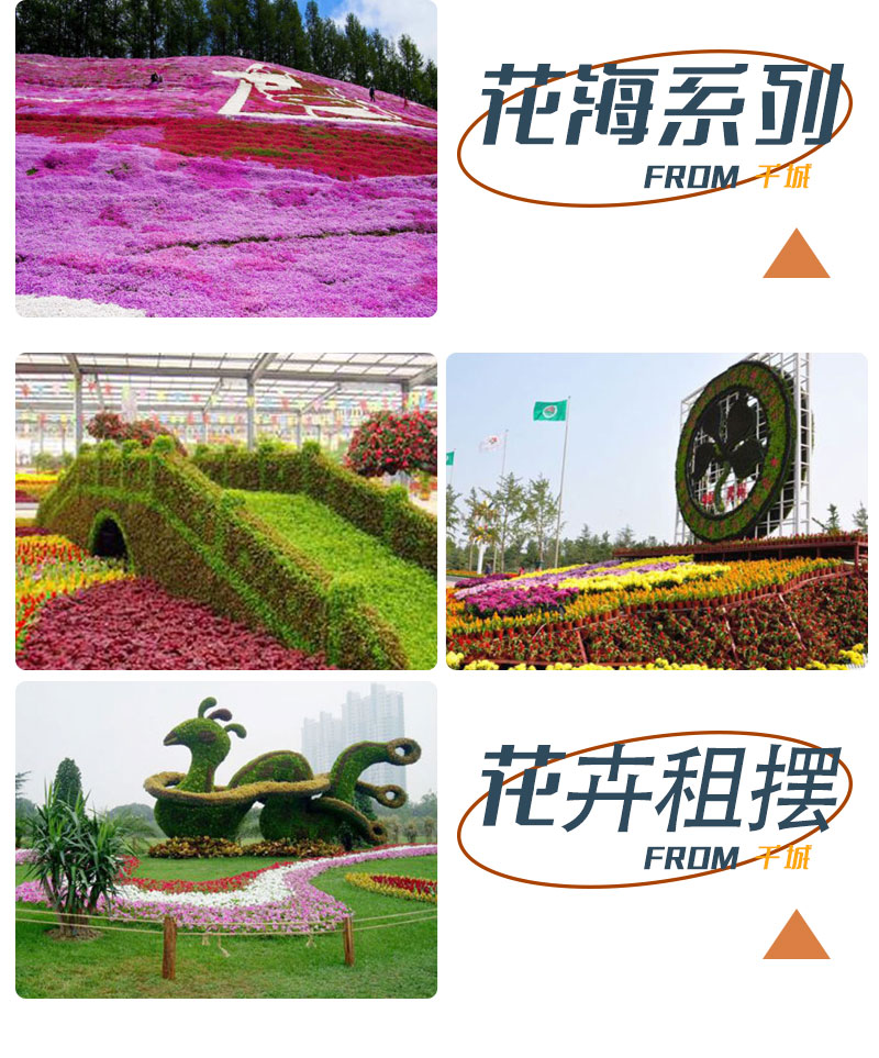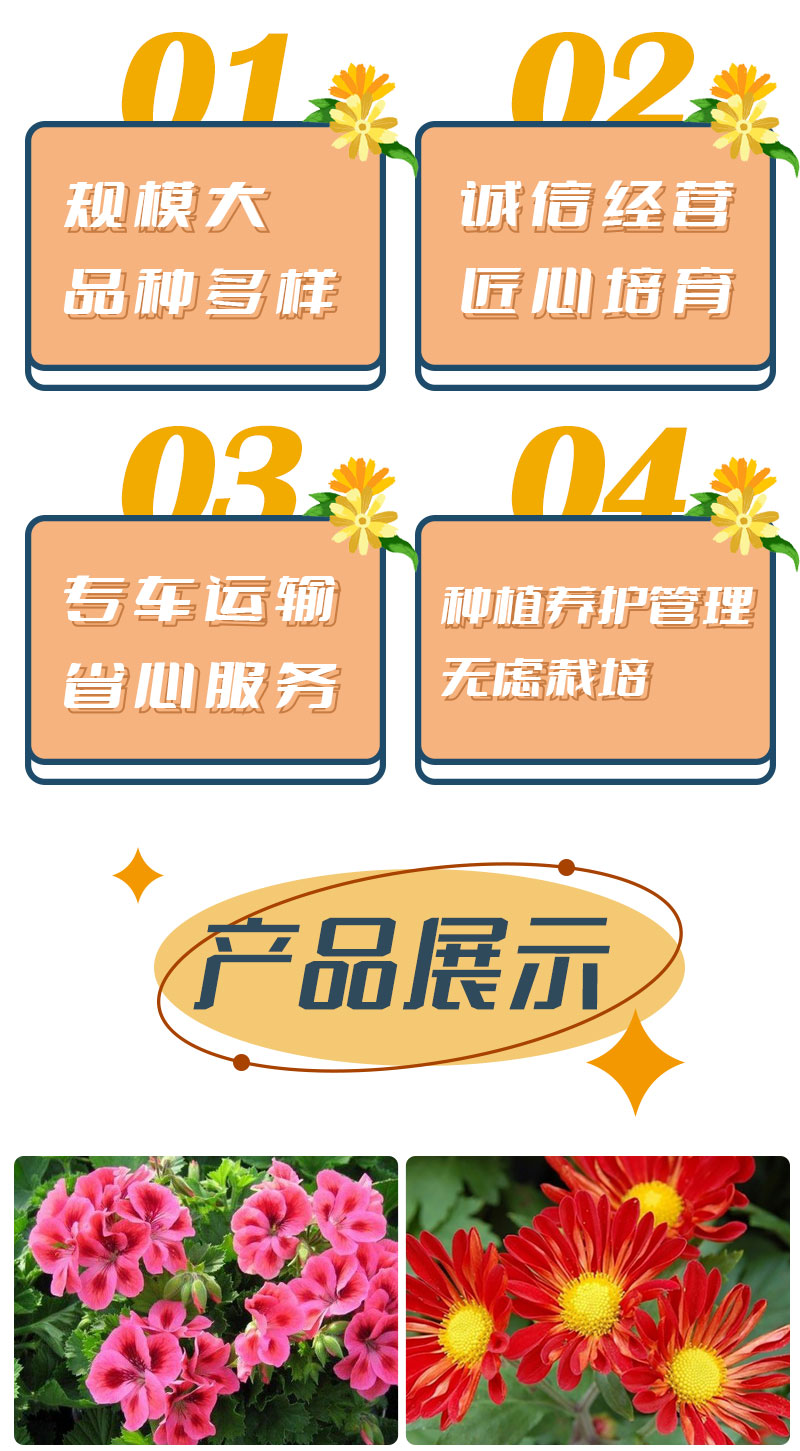 草花系列:垂钓牵牛、矮牵牛、三色堇、一串红、彩叶草、鸡冠花、百日草、金盏菊、翠菊、太阳花、国庆菊、孔雀草、四季海棠、金叶薯、长春花、夏瑾、五色草、鼠尾草、波斯菊、羽衣甘蓝、红叶甜菜等。