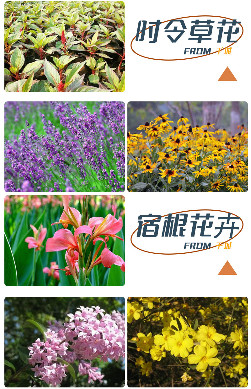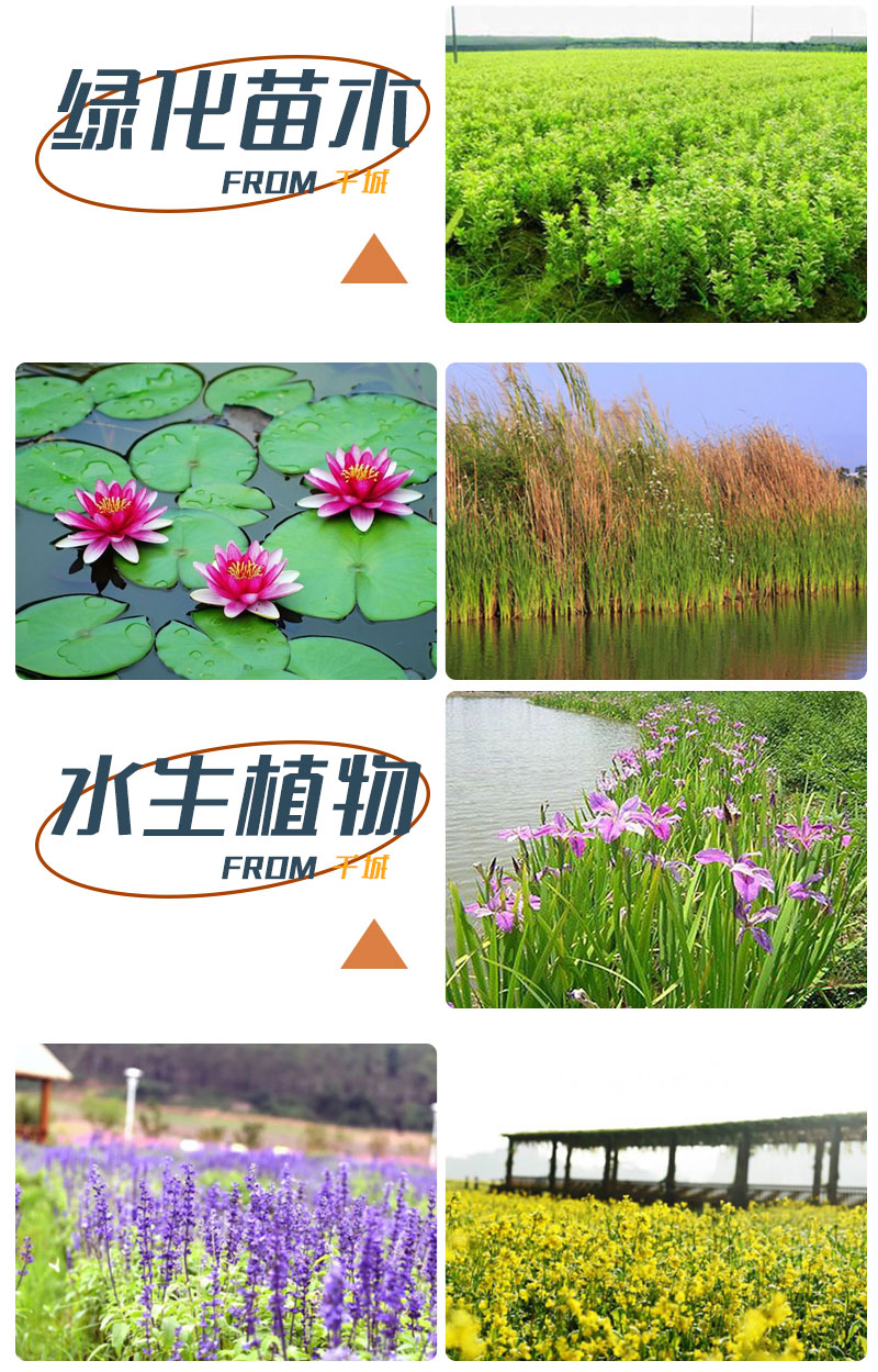 宿根系列:金娃娃萱草、金鸡菊、荷兰菊、金鸡菊、天人菊、松果菊、地被菊、蛇鞭菊、蛇莓、羽扇豆、福禄考、玉簪、鸢尾、各月季、薰衣草、鼠尾草、八宝景天、三七景天、红景天、千屈菜、马兰、石竹、醡浆草、美人蕉、五叶地锦、三叶地锦等。