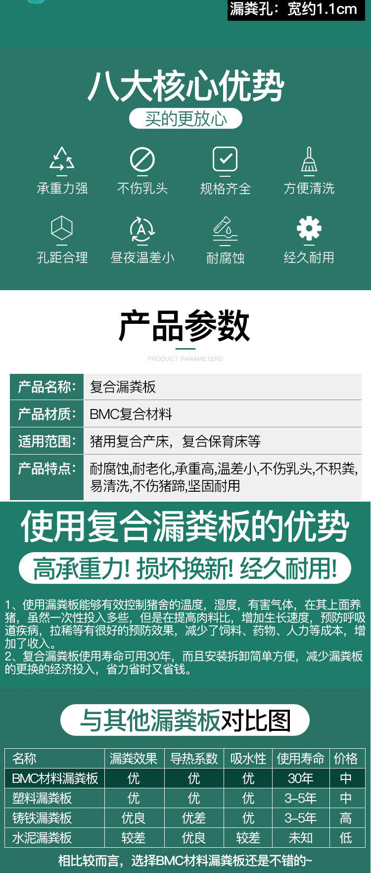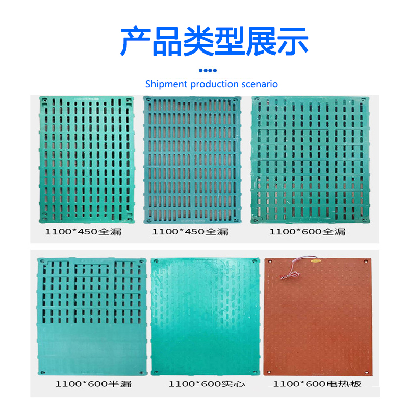 采用不饱和树脂、低收缩剂等各种纤维材料配合螺纹钢筋骨架压制而成的新型漏粪板。具有不伤奶头、不伤猪蹄、不吸水、不老化、不粘粪、易清洗、无需横梁、重量轻运输方便等特点。有扣板式和平板式两类,能满足各种母猪产床漏粪板、母猪分娩栏漏粪板、公猪舍板漏粪板、育肥猪专属板、仔猪保育栏漏粪板、限位栏漏粪板等的需求,是养猪设备中的必选漏粪板。