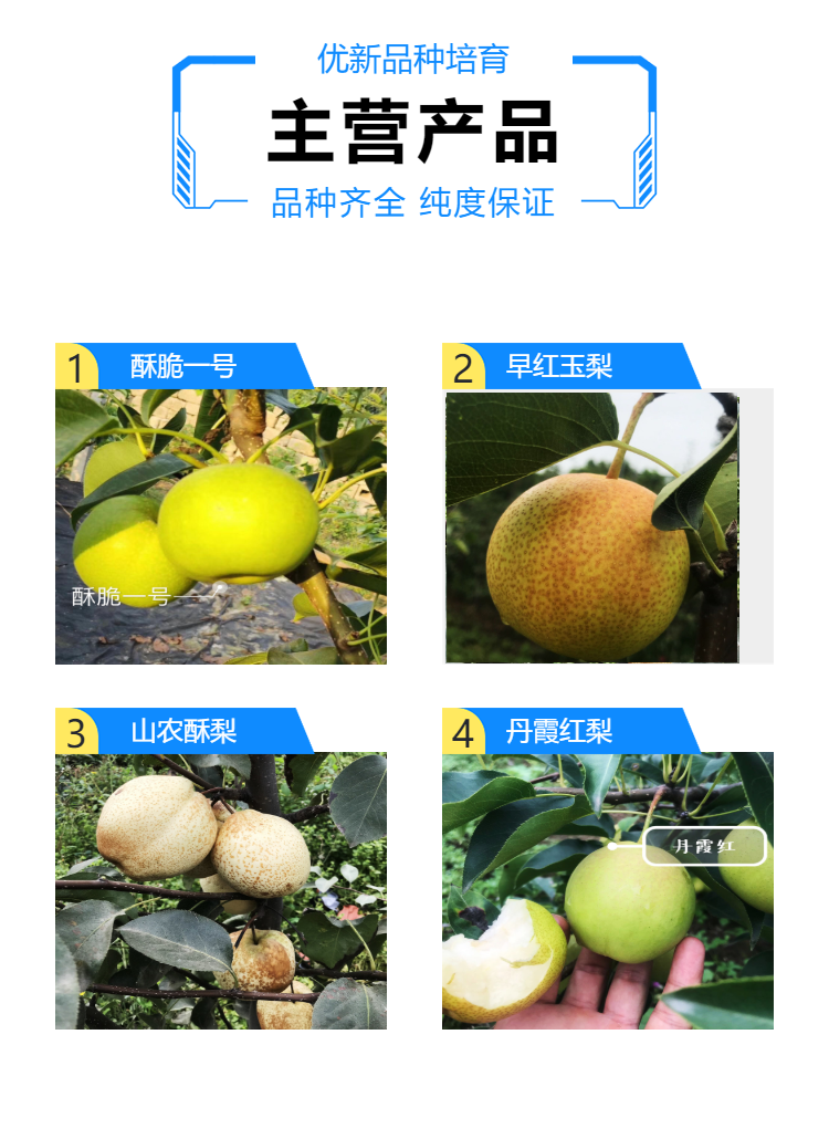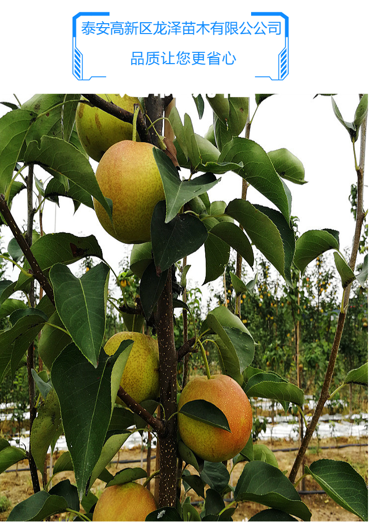 现在市面上梨苗的品种也很多,一般是6月份到8月份为主。10月份的梨很少。山农酥梨的出现填补了晚熟梨树市场的一个空白,山农酥梨是2003年山东农业大学园艺科学与工程学院陈学森团队将采集了砀山酥梨的花粉,拿到新疆塔里木,与当地的新梨7号进行杂交选育的优良品种。因其在性状上一直表现稳定、优良,果肉白色细腻、汁多、味甘甜、香气独特,比普通梨晚熟2个月,被陈学森团队暂定名为“山农酥梨”。