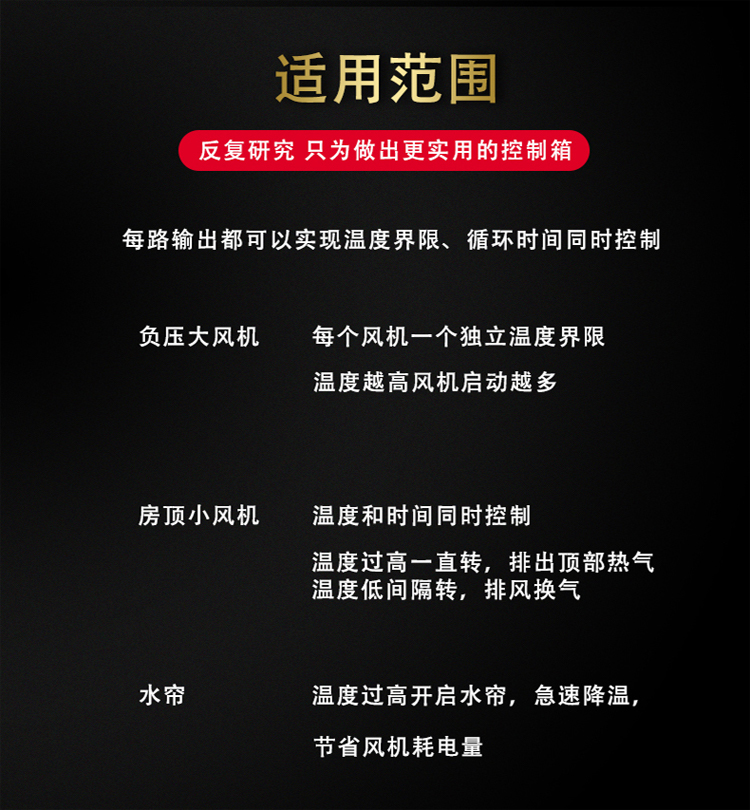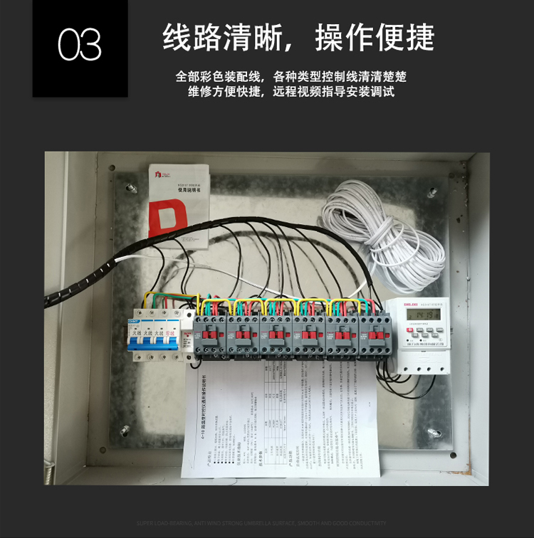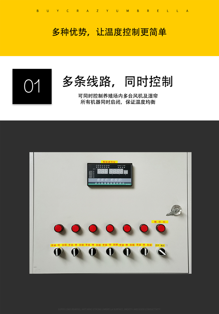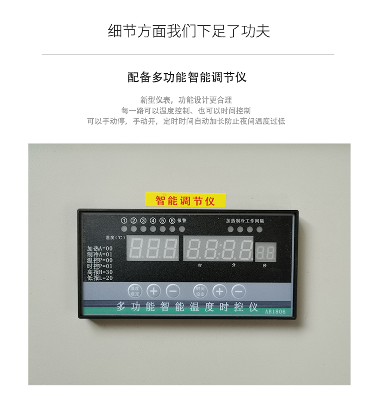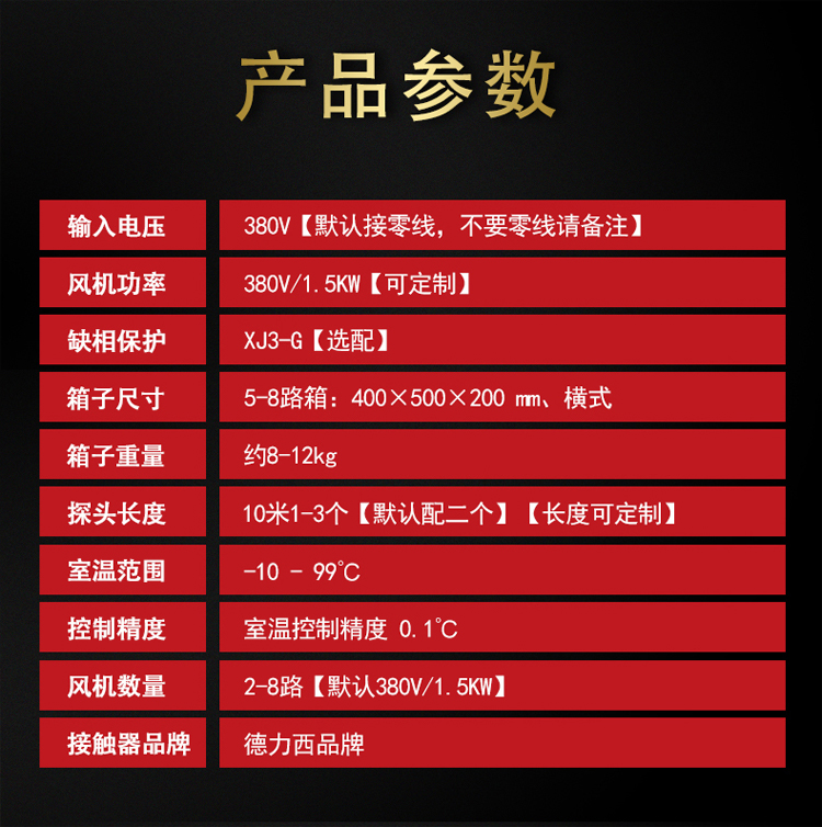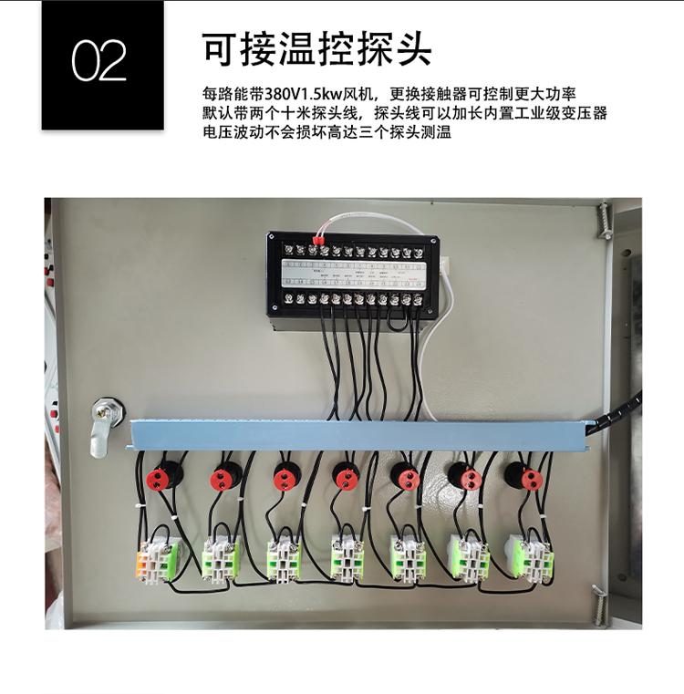 每个温控箱都装有德力西牌缺相保护器,经久耐用,性能可靠。当输入380V电源缺相时,停止所有风机运转,安全保护所有电路安全。
