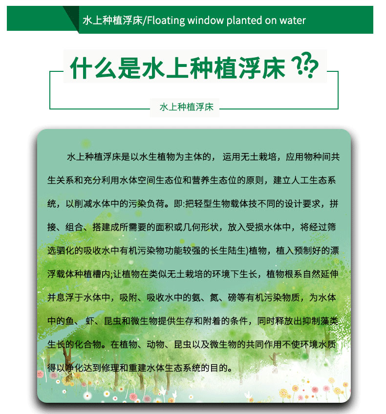 1,浮体、链接快速扣钉、种植篮、种植介质等组成。产品制作采取抗氧化抗紫外技术处理,使用寿命大于6年。