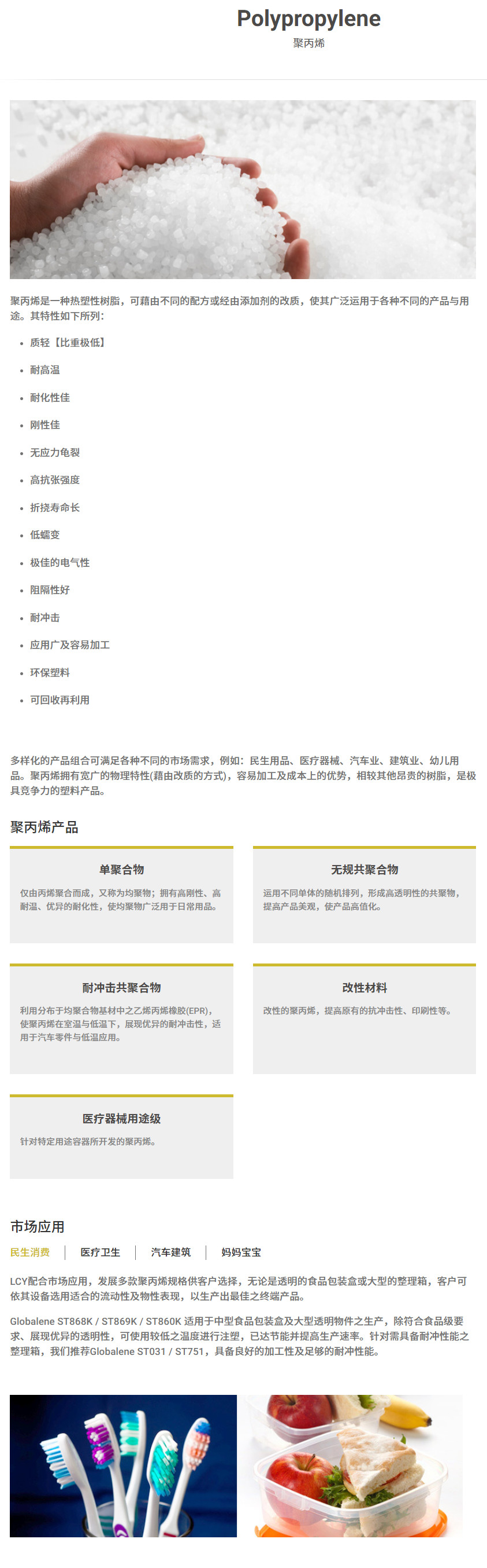 LCY配合市场应用,发展多款聚丙烯规格供客户选择,无论是透明的食品包装盒或大型的整理箱,客户可依其设备选用适合的流动性及物性表现,以生产出之终端产品。