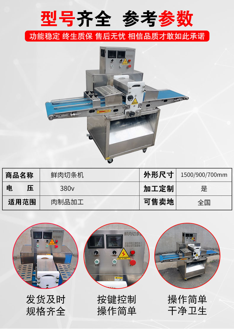 切条机通过更换刀架或者刀割套即可调整切割产品的宽度。采用进口防滑带条纹输送带,清洗方便,输送平稳,可切出均匀的肉条或薄片。输送带可变频调速;刀组、刀架、网带可便清洗。
