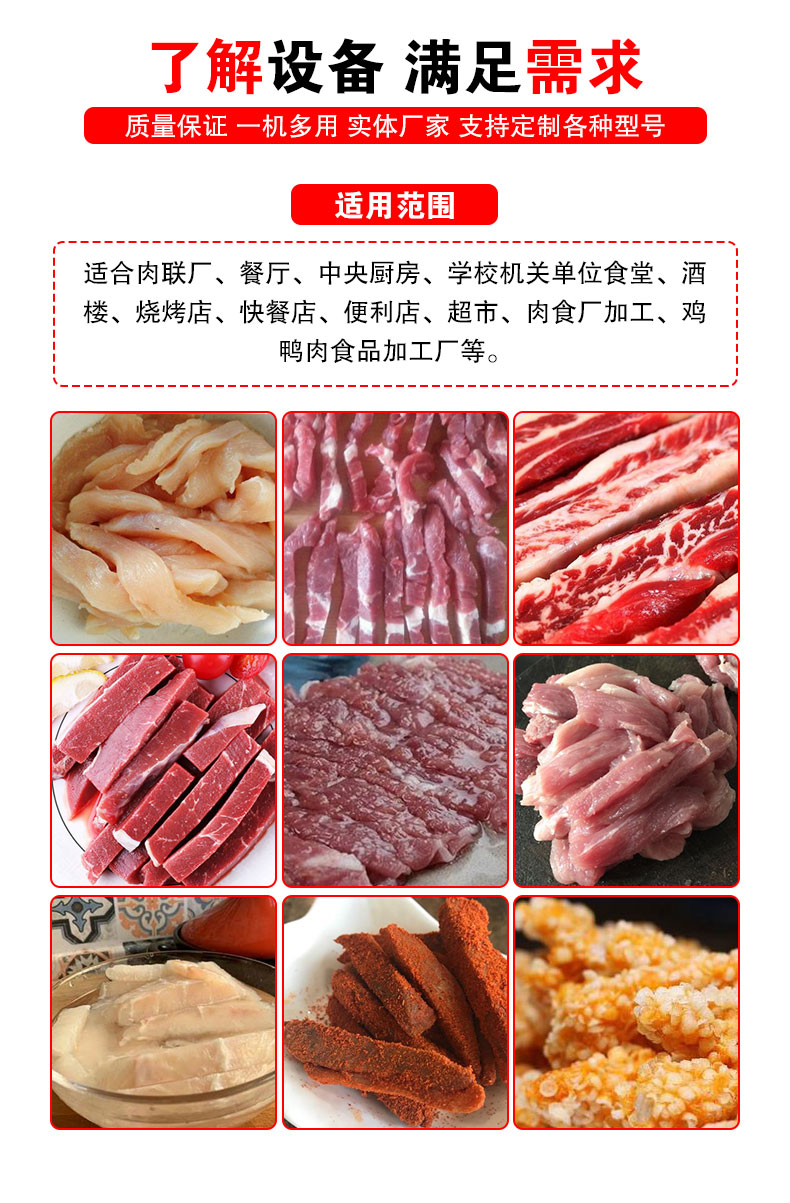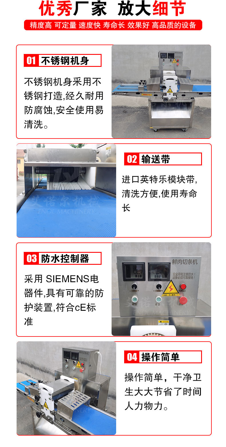 5、切条机切割肉条的宽度准确性较高,减少了人工分切的数量,降低了人工成本,效率高。