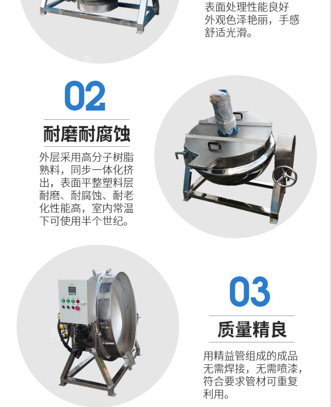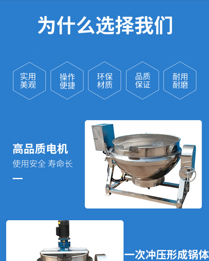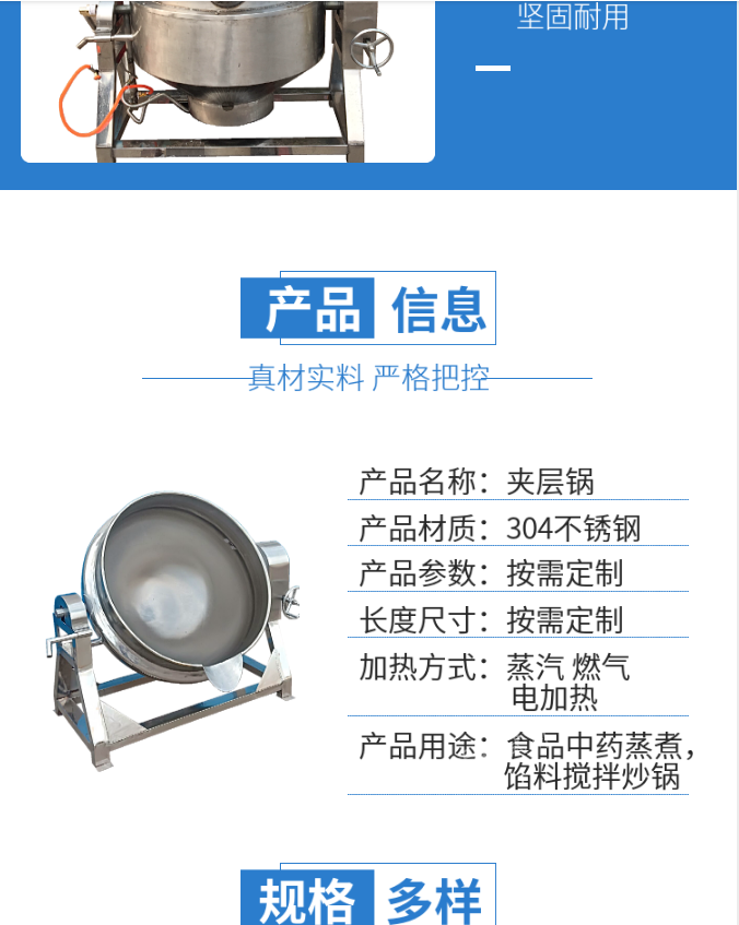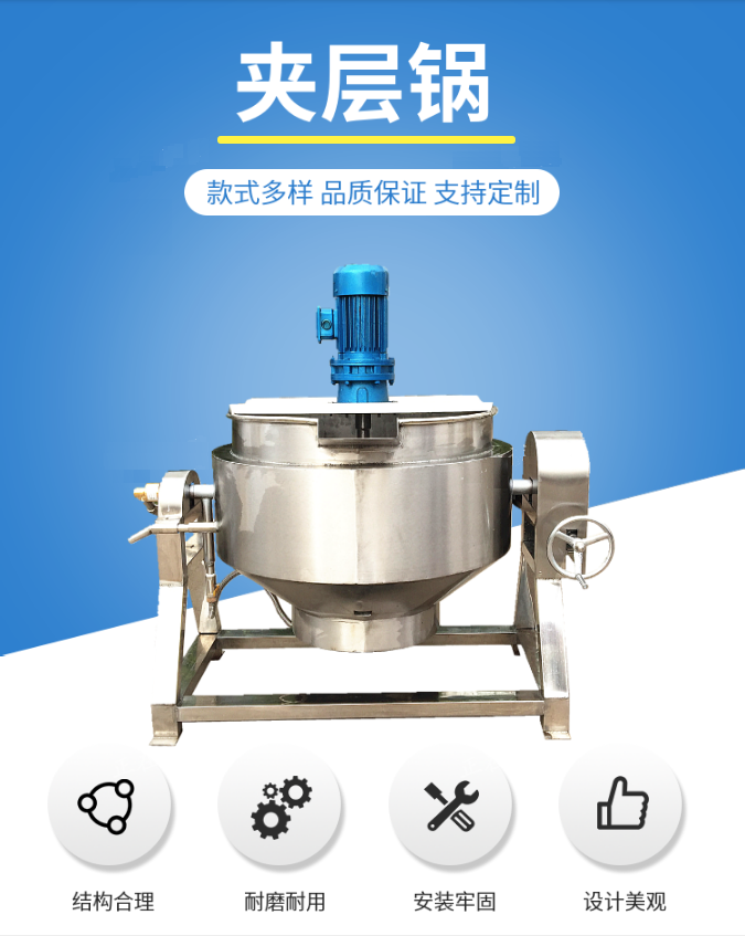 夹层锅我们又叫蒸汽锅、蒸煮锅、夹层蒸汽锅。由锅体和支架组成,中间用于通入加热介质,设备采用304不锈钢制作,具有受热面积大、热效率高、加热均匀、液料沸腾时间短、加热温度容易控制、外型美观、安装容易、操作方便、安全可靠等特点。