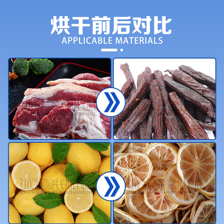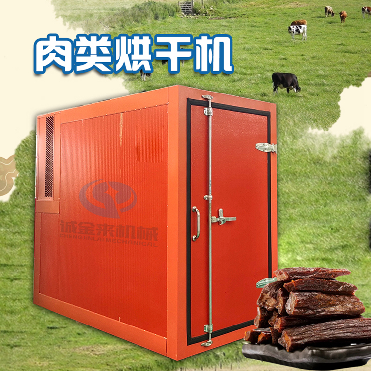 肉类箱式烘干机也是空气能热泵烘干机,该设备烘干均匀,速度快、效率高,且物料不容易粘连,可实现自动控温,自动排潮,能够使烘干物料保持更好的形态,保持烘干物料的颜色和形态,提高了产品质量。另外,采用电加热,可实现自动控温,自动排潮,排潮速度可调。燃煤热风炉,配置合理,使工作温度在35℃-85℃,无须特殊管理,只须定时加煤即可。肉类烘干机工作原理:利用热泵蒸发器吸收外界空气中的热量,或者回收干燥过程中排气的余热,经过压缩机做功,将能量搬运(转移)至烘干箱中,烘干箱内的热空气经过反复循环加温,吸收物料中的水分,自身降温加湿,经过热风排湿或者冷凝除水的过程,把物料中的水分水排出带走,并较终实现物料的连续干燥,较高输出温度为85℃。