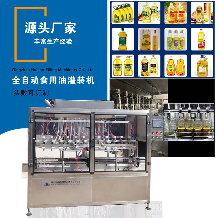 惠联量身订制全自动食用油灌装机生产线,可自由选配,比如单机使用,比如+自动压盖机+自动贴标机+喷码机等设备组成大中小型生产线。报价低,价格实惠。